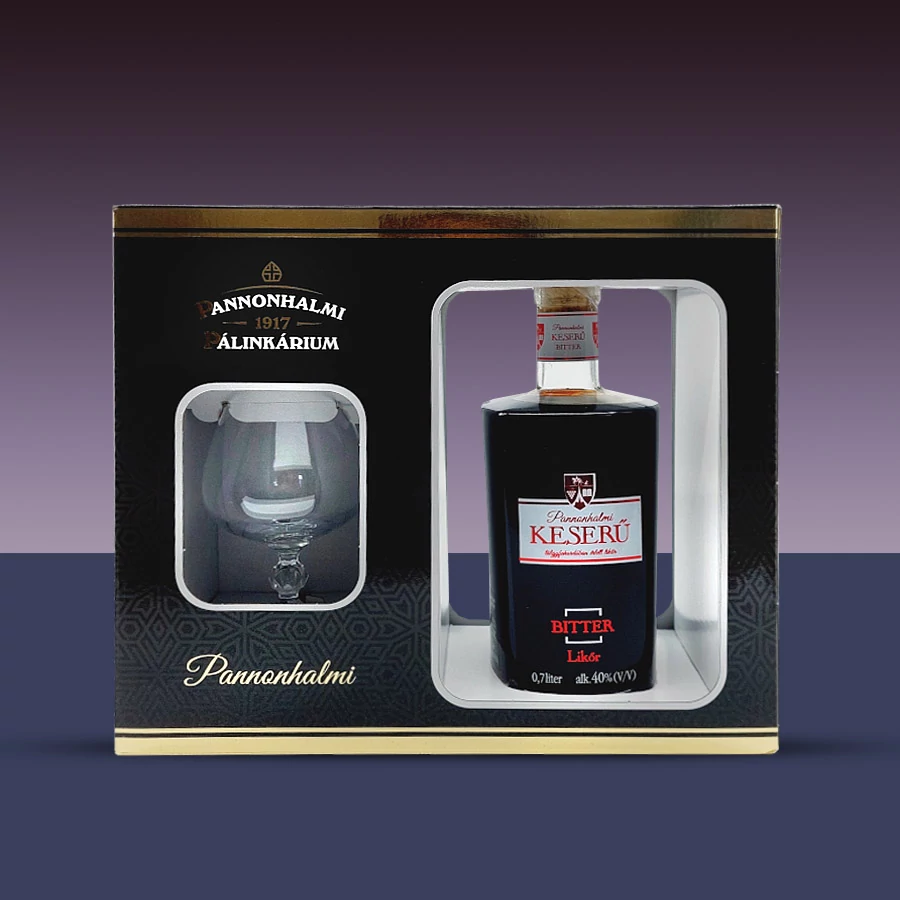 Pannonhalmi Keserű likőr elegáns díszdobozban, pohárral összecsomagolva.