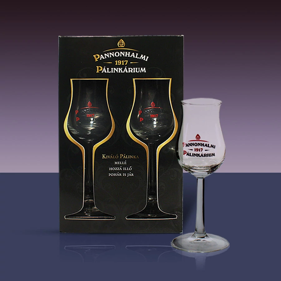 Logózott pálinkás pohár, 2 férőhelyes díszdobozba csomagolva. Kiváló kiegészítő, mikor pálinkát vásárolunk ajándékba.